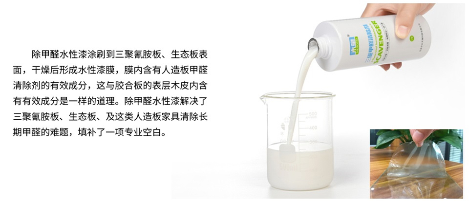 因此,如果用人造板甲醛清除劑涂刷三聚氰胺板、或油漆表面,有效成分只能停留在表皮的外面,一旦清潔家具,有效成分就被擦除,除甲醛的作用就沒(méi)了。對(duì)于這個(gè)難題,我們于2006年就開(kāi)始研發(fā)除甲醛的水性涂料,直到2017年這款產(chǎn)品各方面性能才達(dá)到我們認(rèn)可理想效果,推向了市場(chǎng)。從產(chǎn)品性質(zhì)上說(shuō)這款產(chǎn)品屬于水性涂料、水性漆。