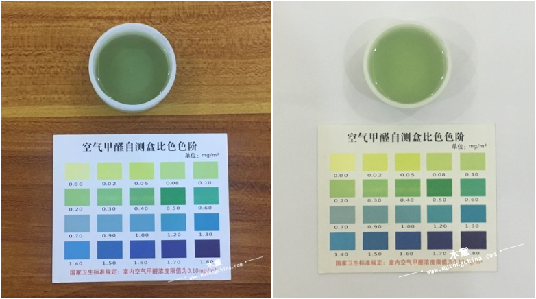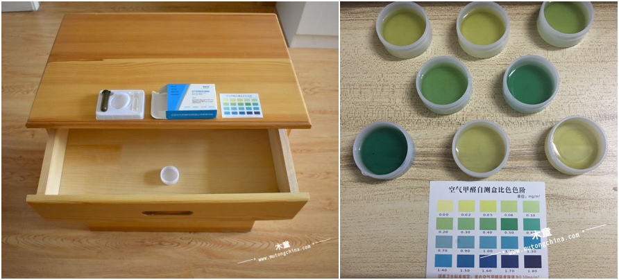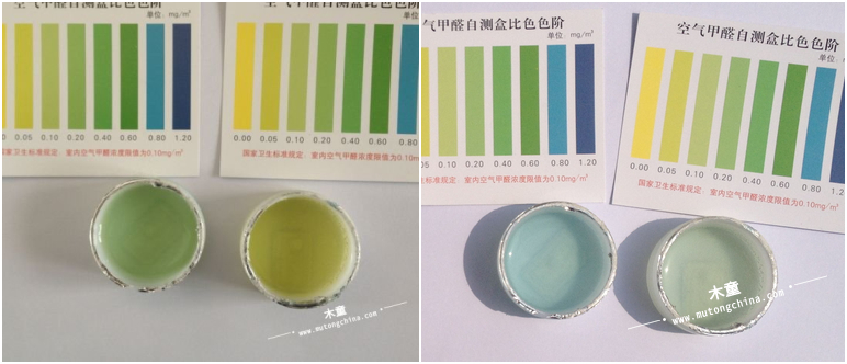 右上圖是客戶發(fā)來的檢測(cè)結(jié)果,圖中第三排兩個(gè)淺黃色的是房間內(nèi)的檢測(cè)結(jié)果,其他六個(gè)都是家具內(nèi)的檢測(cè)結(jié)果。家具內(nèi)甲醛明顯比房間內(nèi)高很多。