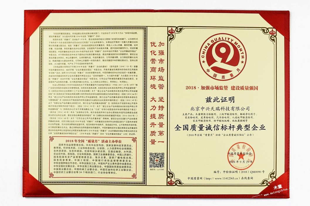 我北京中興天瑞科技有限公司自2000年成立之初,始終堅持誠信服務和產品質量為核心,以幫助客戶有效解決室內空氣污染問題為宗旨。18年來,木童連續不斷榮獲廣大客戶的廣泛好評。2018年全國質量月活動中,我公司榮獲“全國質量誠信標桿典型企業”殊榮。