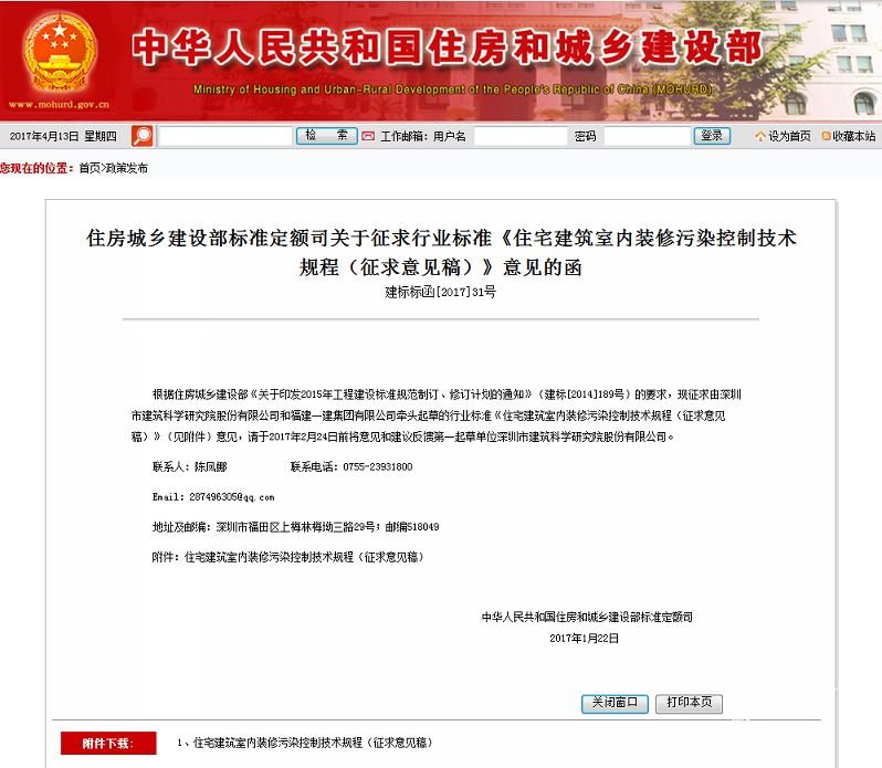 由國家住房和城鄉(xiāng)建設部提議,深圳建筑科學研究院、福建一建集團有限公司主編,清華大學、上海建筑科學研究院、中國建筑科學研究院、(北京中興天瑞科技有限公司旗下子公司)濟南木童環(huán)保科技有限公司、萬科企業(yè)股份有限公司、中國林科院木材工業(yè)研究所等十多家專業(yè)單位聯(lián)合編制的《住宅建筑室內裝修污染控制技術標準》行業(yè)標準,已報送住房城鄉(xiāng)建設部標準定額司,并得到了高度評價,在完成征求廣泛建議完善后,將按法定程序進行定稿、公布、執(zhí)行。