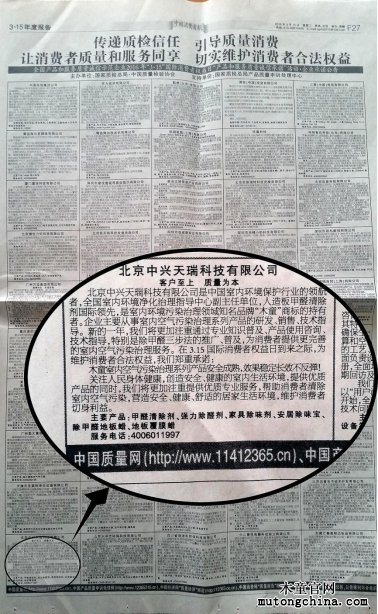 本次315活動之際,我北京中興天瑞科技有限公司的甲醛清除劑、強(qiáng)力除醛劑、家具除味劑、安居除味寶、除甲醛地板蠟、地板覆膜蠟等產(chǎn)品,經(jīng)過中國質(zhì)量檢驗(yàn)協(xié)會與國家質(zhì)檢總局質(zhì)量申訴處理中心的抽查評審,榮獲“全國產(chǎn)品和服務(wù)質(zhì)量誠信示范企業(yè)”。