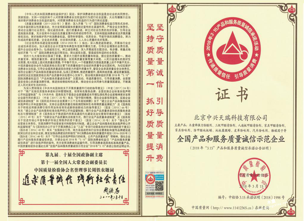 日前,在國(guó)家質(zhì)量監(jiān)督檢驗(yàn)檢疫總局(以下稱國(guó)家質(zhì)檢總局)質(zhì)量申訴處理中心支持中國(guó)質(zhì)量檢驗(yàn)協(xié)會(huì)組織開(kāi)展2018年“3.15”國(guó)際消費(fèi)者權(quán)益日“產(chǎn)品和服務(wù)質(zhì)量誠(chéng)信承諾”主題活動(dòng)中,質(zhì)檢總局產(chǎn)品質(zhì)量申訴處理中心從全國(guó)各行業(yè)的幾萬(wàn)家企業(yè)單位中特別樹(shù)立了一百家質(zhì)量誠(chéng)信標(biāo)桿示范企業(yè),我北京中興天瑞科技有限公司喜獲“全國(guó)百佳質(zhì)量誠(chéng)信標(biāo)桿示范企業(yè)”之列,深感榮幸和責(zé)任重大。