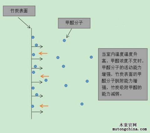 當環(huán)境中的溫度升高時,甲醛分子的活動能力增強,就會有更多的甲醛分子擺脫活性炭的吸附跑出來,竹炭的吸附能力就會下降。