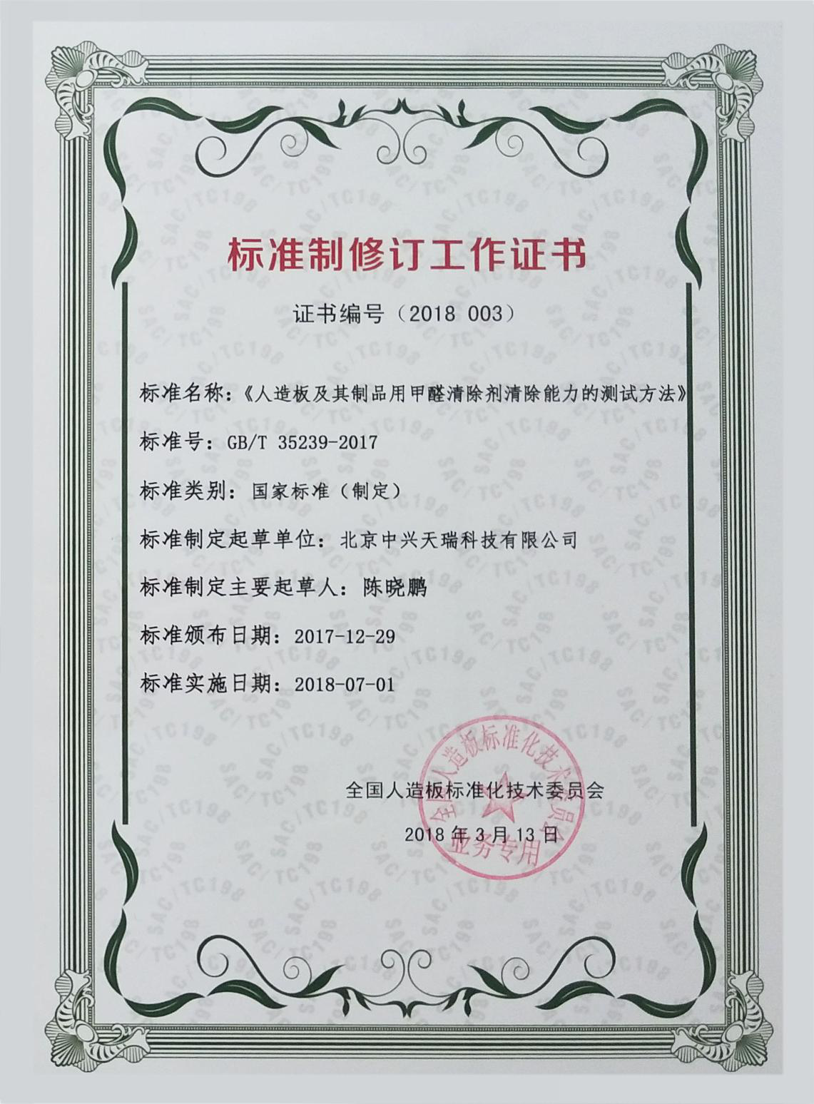 “人造板甲醛清除劑”是目前唯一有國家標準檢驗的“甲醛清除劑”產品,其他甲醛清除劑都沒有國家標準(國家標準:《人造板及其制品用甲醛清除劑清除能力的測試方法》)